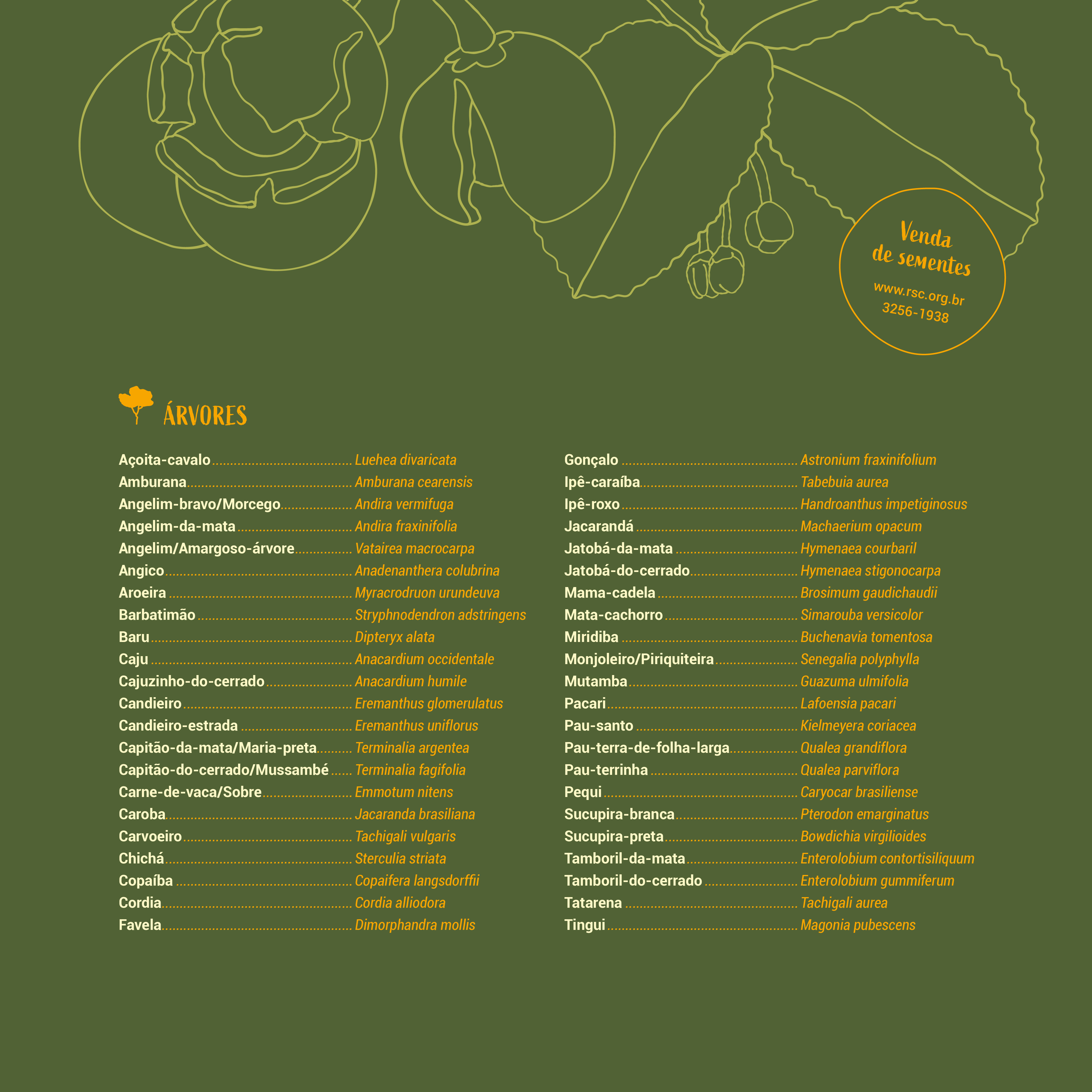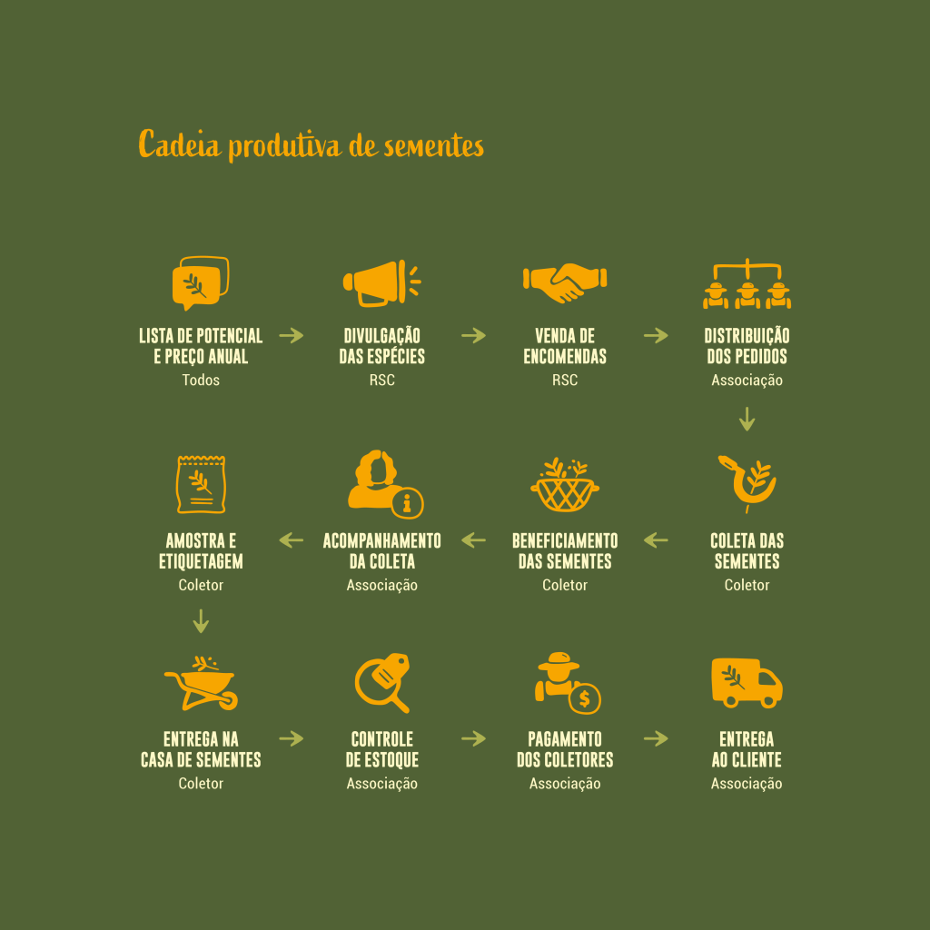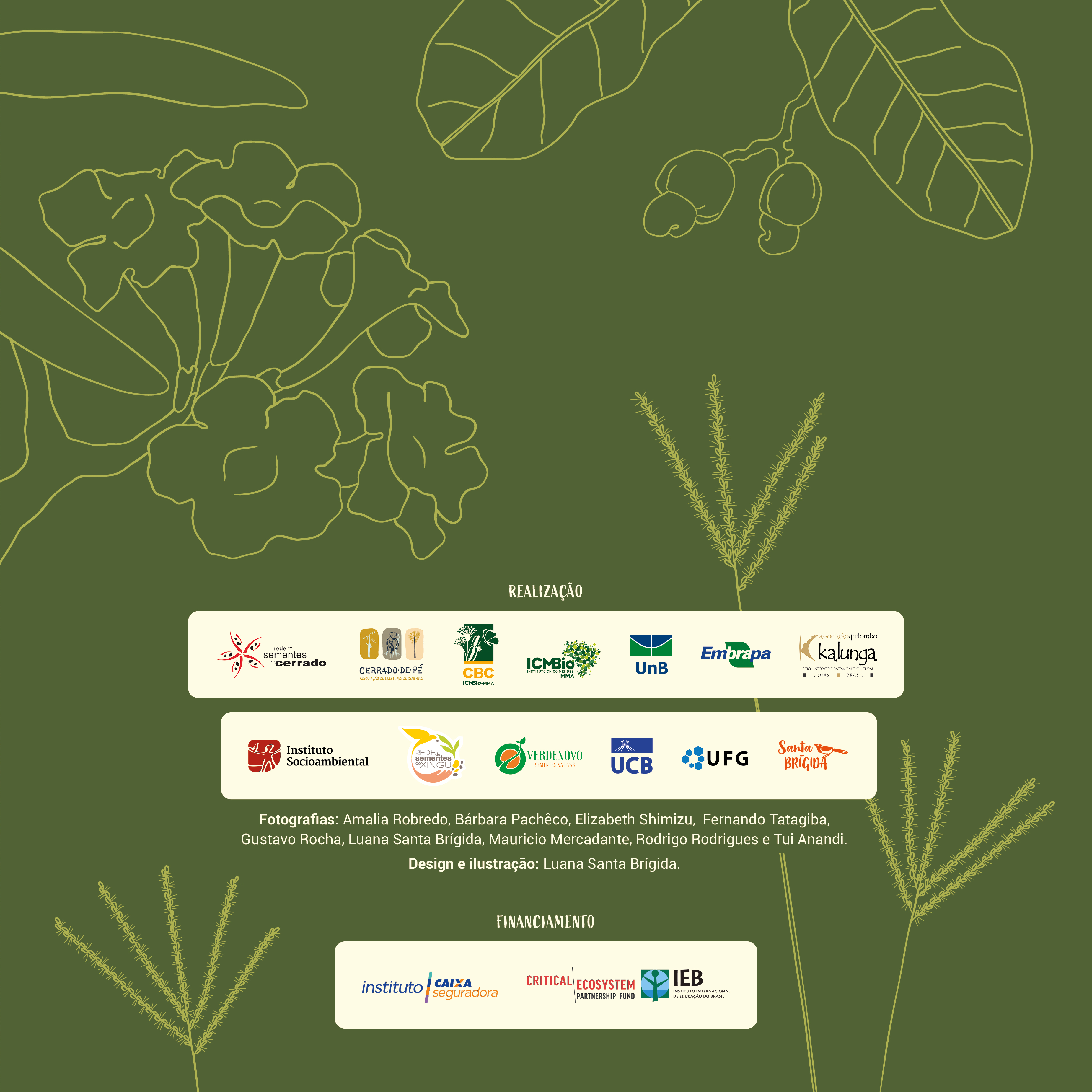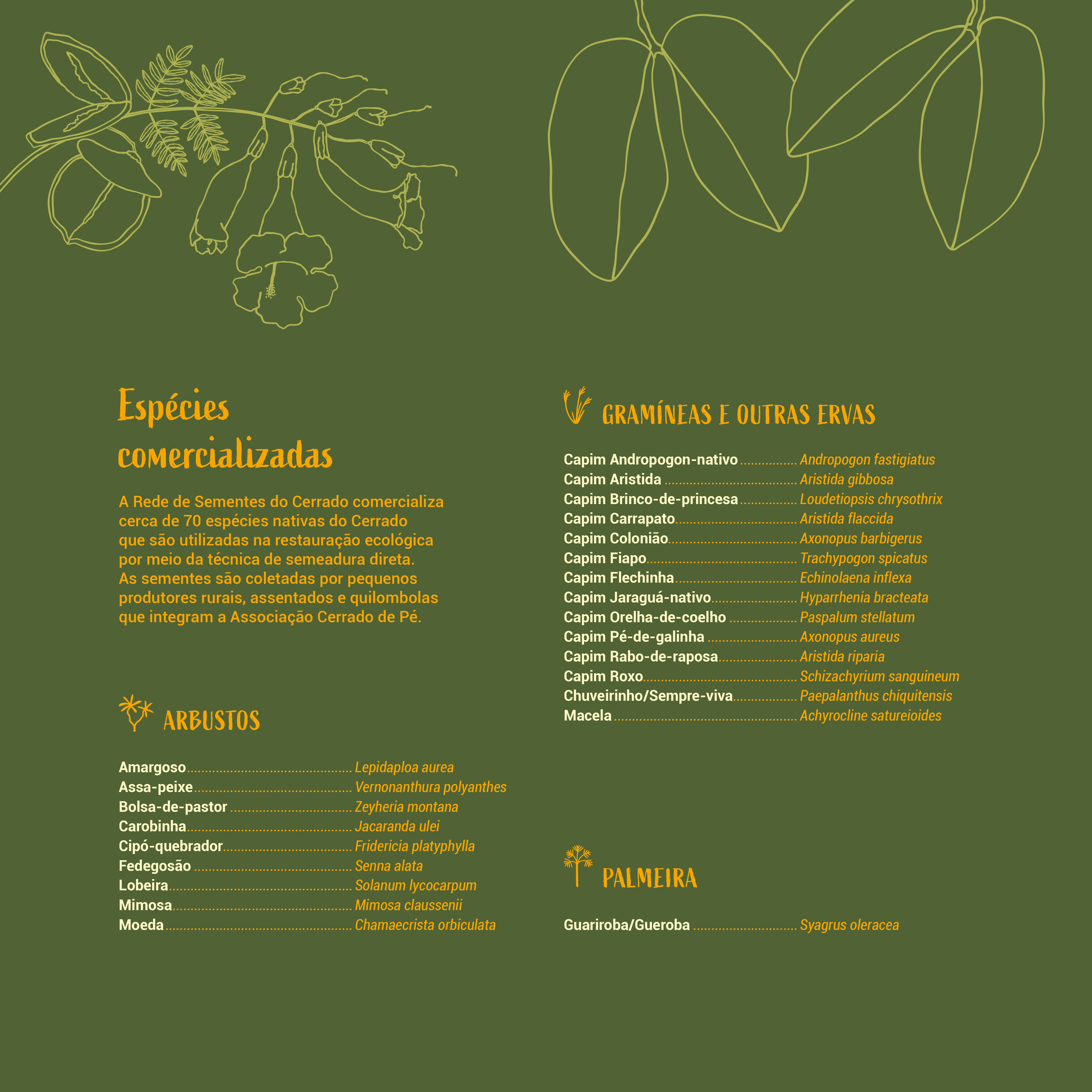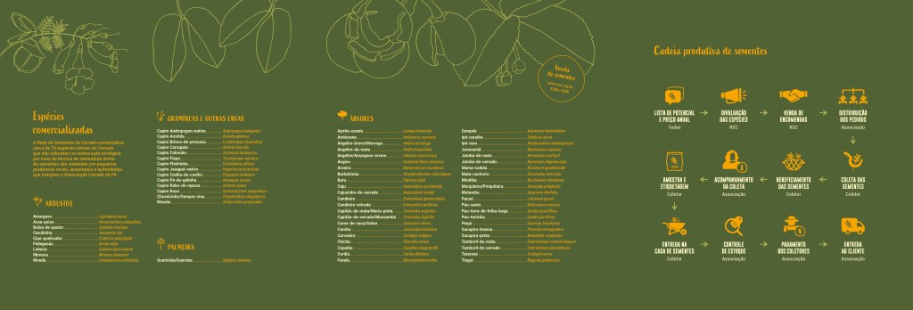 Produzido em parceria com a Rede de Sementes do Cerrado e Associação Cerrado de Pé, a peça reúne informações-chave sobre vinte espécies nativas entre árvores, arbustos, gramíneas e outras ervas recorrentes em áreas de cerrado aberto. De um lado, o cartaz compila dados de consulta cotidiana dos coletores, enquanto o verso, dobrado como um folder de 6 páginas, oferece mais detalhes sobre a cadeia produtiva envolvida na comercialização das sementes.