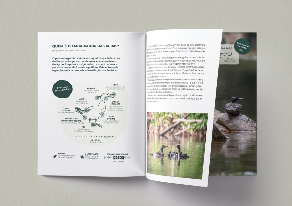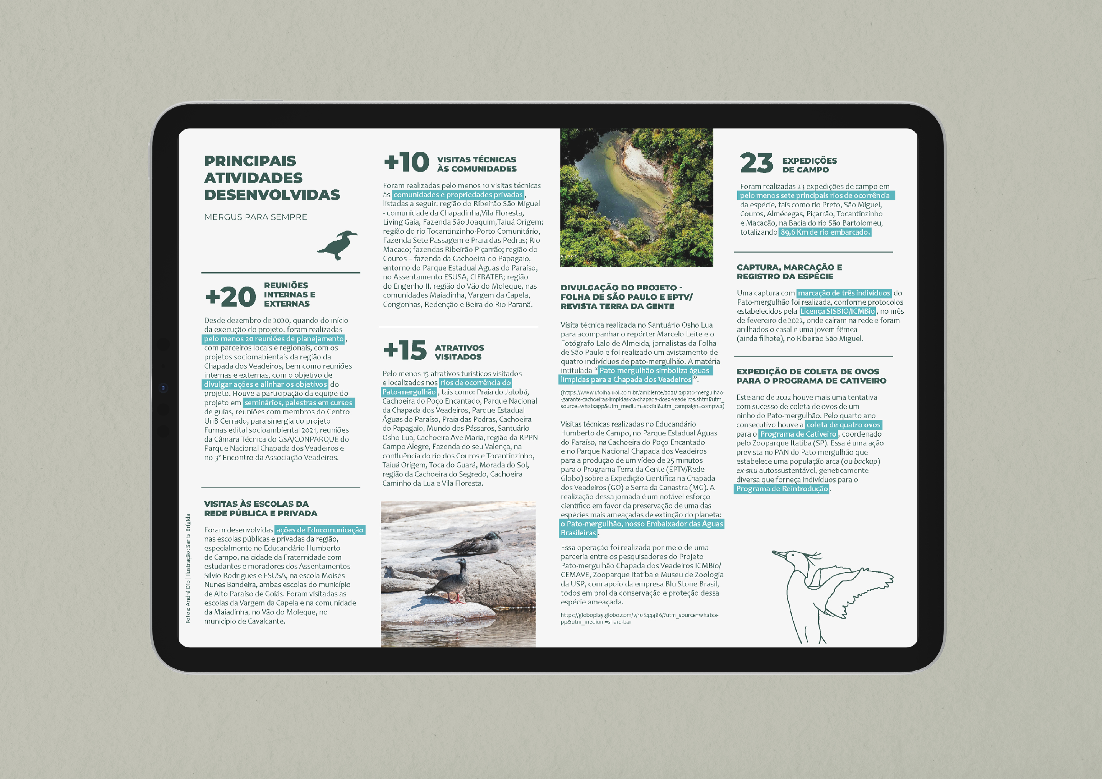 Atividades realizadas: Acompanhamento de expedições em campo com cobertura fotográfica; apoio à exposição Mergus para Sempre (com fotografias de André Dib); ilustração e criação de peças para mídias sociais e publicações editoriais.