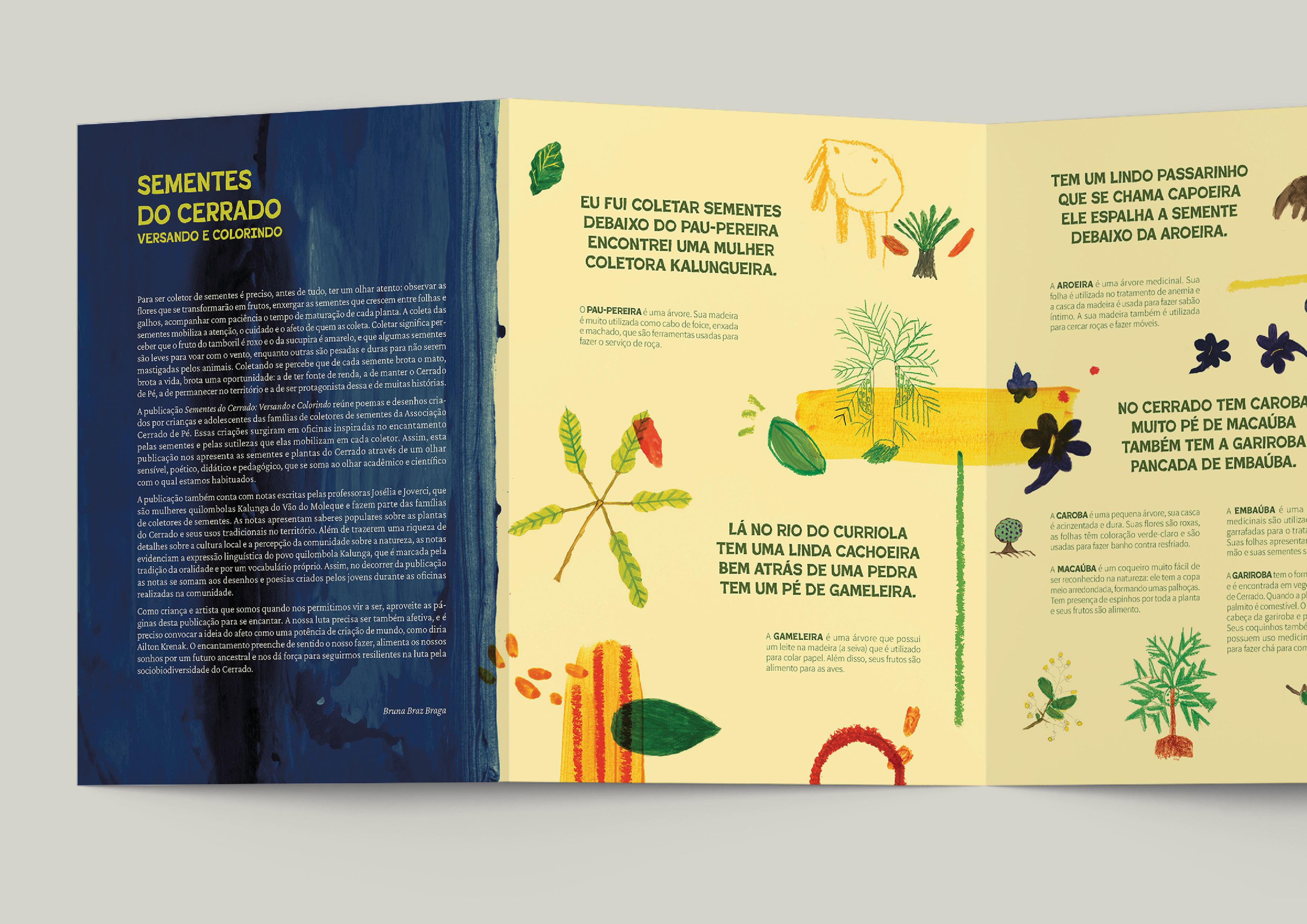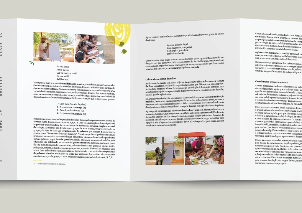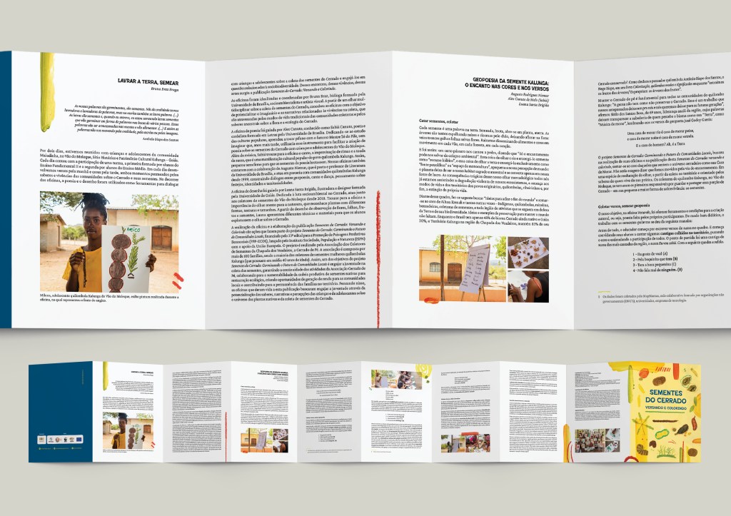A obra “Sementes do Cerrado: versando e colorindo” é fruto das oficinas de poesia e ilustração oferecida para crianças e jovens da comunidade Maiadinha, no Vão do Moleque, Território Quilombola Kalunga. Todos os produtos, a coleção de camisetas e a publicação impressa, foram produzidos a partir de textos e desenhos criados pelos participantes da oficina e distribuídos na própria comunidade.