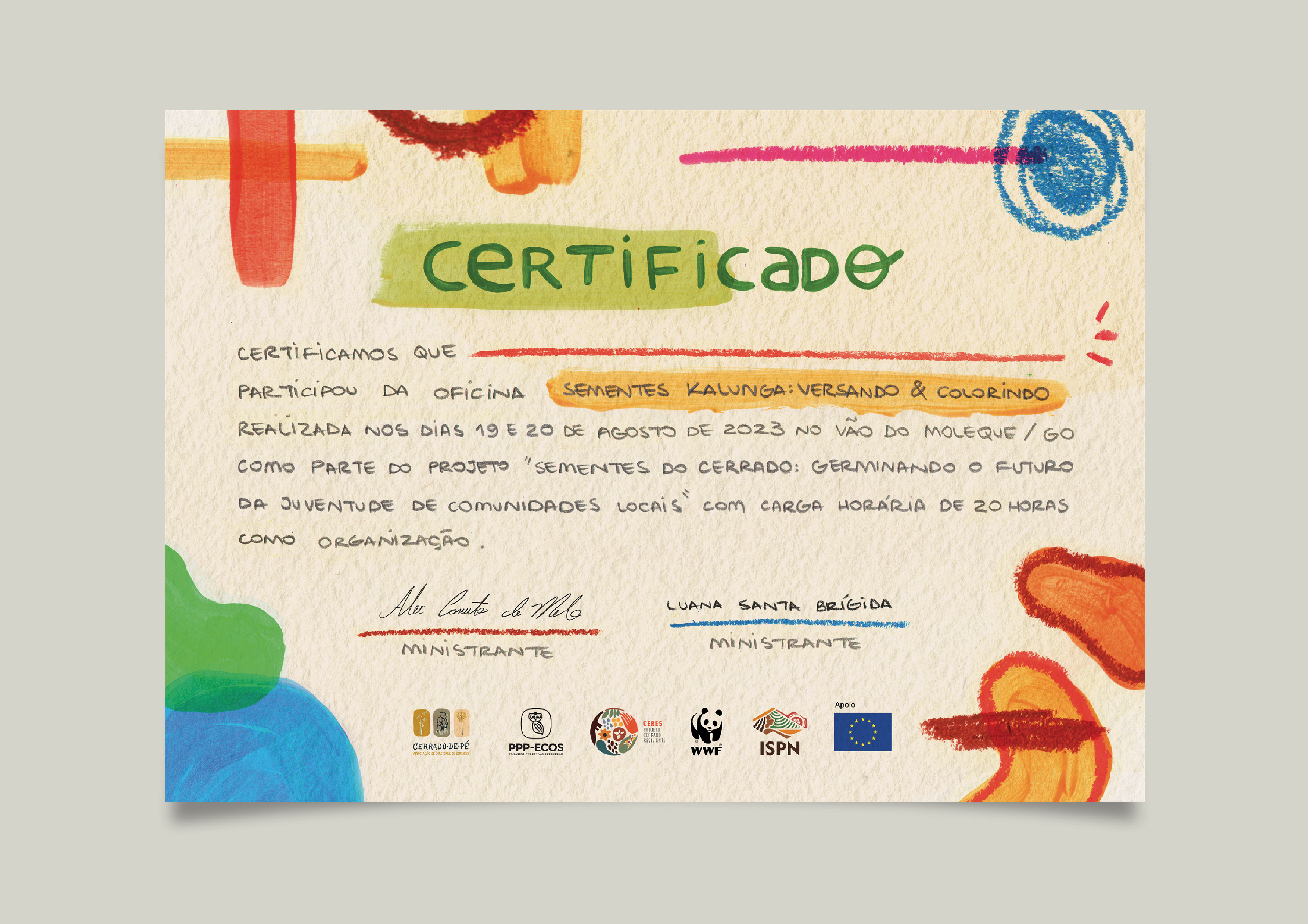 As atividades foram ministradas por Luana Santa Brígida e Sabiá Canuto, sob coordenação de Bruna Braz, pela Associação Cerrado de Pé (ACP), por meio do Fundo de Promoção de Paisagens Produtivas Ecossociais (PPP-ECOS) gerido pelo Instituto População, Sociedade e Natureza (ISPN).